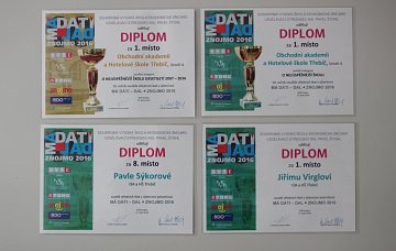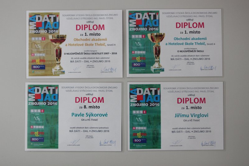 Ve dnech 26. - 27. 1. 2016 proběhl ve Znojmě 10. ročník celorepublikové soutěže v účetnictví určený studentům středních škol s názvem Má dáti, dal 2016, který zorganizovala Soukromá vysoká škola ekonomická Znojmo. Soutěžící museli prokázat praktické dovednosti v souvislých příkladech v rozsahu 4 x 60 minut a teoretické znalosti v testu obsahujícím 100 otázek, zpracovávaném na PC. Soutěže se zúčastnilo 105 žáků z 52 středních škol. Naši školu reprezentovali Jiří Virgl a Pavla Sýkorová z 4AOA. Jiří Virgl obsadil 1. místo, Pavla Sýkorová 8. místo v soutěži jednotlivců. V soutěži škol obhájili loňské prvenství. Zároveň přispěli k získání 1. místa v soutěži o nejúspěšnější školu celé historie soutěže.